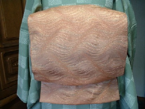 この帯は10数年位前、帯の展示会へ仕事で見に行った時に、ひと目惚れした袋帯です。今も昔も、変わった洒落帯が大好きです。 この波筬の袋帯は手先が30cm程長く、切ってしまうのはもったいないと思い、そのまま使用していましたが、やはり使いづらくて 3年程前に丁度いい長さに切りました。主に春・秋に使用しています♪