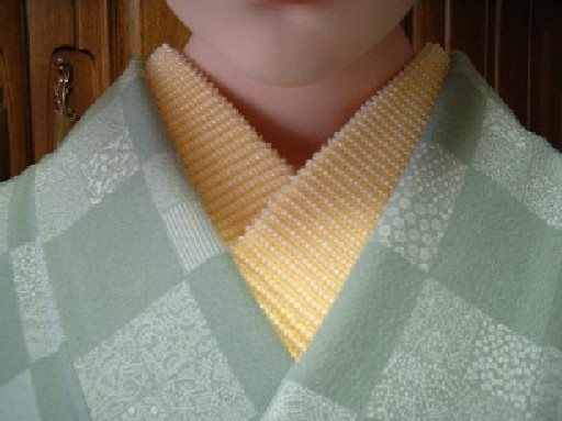 このビーズの半衿は15年ほど前に 初めて編み上げたものです。黄色のレース糸に、アイボリーのビーズで編みました。今では レース糸の種類も豊富ですね。でも、その頃 種類は少なくて・・・。黄色は嫌だったのですが一番合わせ易いと思いまして、この色にしました。黄色が強調されないようにビーズの色はアイボリーにしてみました。いかがでしょうか・・・♪ そんなに嫌な色ではないでしょう。