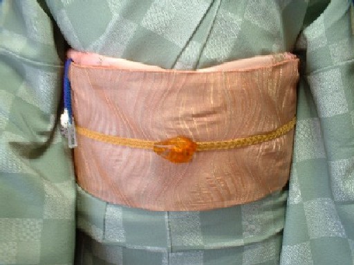 金茶とピンクのボカシ染め。全体に淡いお色なので、合わせ易い帯揚です。織りは、市松で細かい花が色糸で織り表わされています。この日のお着物と同じ市松。自分だけのこだわりのお洒落ですね。