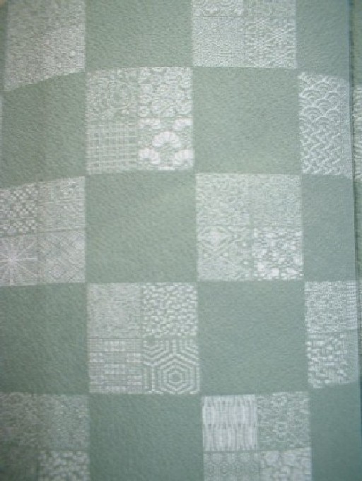 展示会で一目惚れの小紋。無地と江戸小紋柄の市松紋様。柄の部分は更に それぞれ4種類の型で紋様を表わしています。全部で何種類の紋様が入っているのでしょう。型彫りも大変だわ~って感心しました。