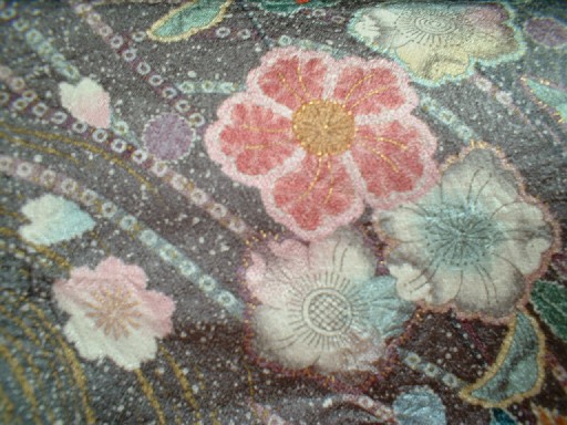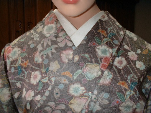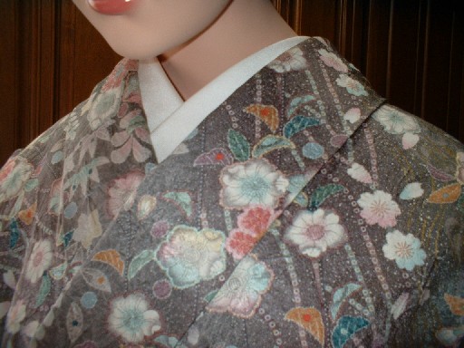 グレー地に辻が花の小紋です。刺し色がとても上品で、とても気に入っています。全体に流れるような柄なので、帯はすっきりと決めるようにしています。