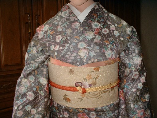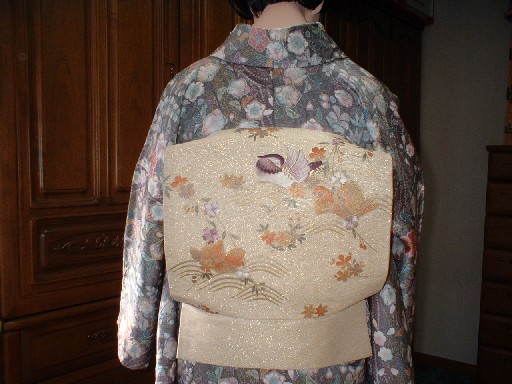 私が初めて購入した帯です。柄はおしどり。ところどころに、刺繍が施されています。地色がクリーム色ですので、大変合わせやすい帯です。ポイント柄ですので、最初は苦労しました。大変懐かしい帯です♪前の柄と 後ろの柄までの間隔あまりないので、柄出しが大変でした。このような失敗も、帯を購入する時のポイントとして 活かしています。今はもうこの帯を締めることは、ほとんどありません。懐かしいので、今回は合わせてみました。