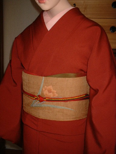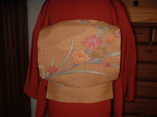 スワトウ刺繍部分から中の芯が見えますので、カラー芯を使ってのお仕立てです。芯のお色は私の大好きな金茶です。こちらの帯は、前の柄とお太鼓柄の間隔が短かったので、見えない部分に生地を足して頂きました。落ち着いた色合いですので、合わせやすく さりげないお洒落感が好きです。
