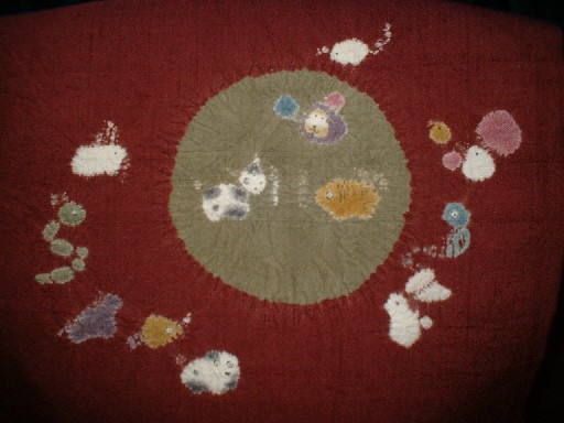 お太鼓柄の拡大です。何をしていると思いますか?相撲をとっているのですね。おさるさんが行司。牛さんとトラさんの対決です!